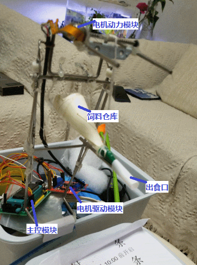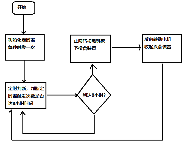 由主控板上的软件做好时间控制,在到达喂食时间点后,通过高低电平控制电机驱动板控制电机正转一定时长,使得饲料投放装置落下,饲料从出口落出,再控制电机反转,拉起饲料投放装置。